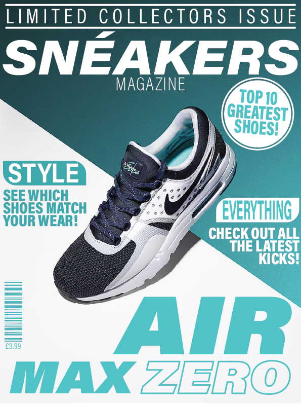 Firstly I added coverlines, therefore I showed more use of fonts and their colours. All copies of text have been matched with colours used from the original background, as the navy blue from the shoe wasnt suitable anywhere. The barcode is now positioned away from the masthead so its not in the way and doesn’t draw the audience somewhere else. All fonts have been changed to a sans-serif, and all remain single colours. Except for the “ZERO”, I removed the fill and added a stroke as 0 represents a quantity of nothing.