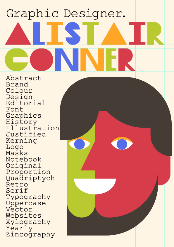 I then created a self portrait of me made inside Illustrator. As I had all individual shapes created I still had to decide what colours each part of me is going to be. I could have simply sourced colours from a photo of my face using the eyedropper tool, however I wanted this poster to look creative. And because I didnt want too many colours on one poster I used the four from the name I made. This shows that even though the colours in your portraits dont match you, they can still look good when they are not. Still, I made my hair and beard brown because I wasn’t happy with the others. The words down the side of my portrait are meant to connote words that I am familiar and understand from the genre graphic design. To make my poster more interesting I wrote them in a A-Z form.