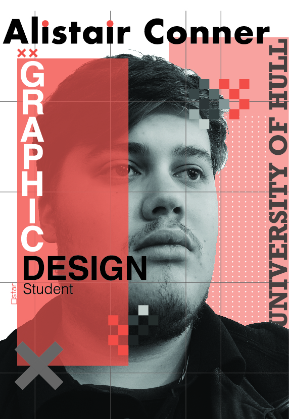 For my second promo poster I wanted to show that I wasnt self taught and that I fully understand the programs I am going to be working with in the future. I did this by creating a poster promoting that I’m a student for Hull University. I started this design off with a portrait of me turned black and white using Photoshop. Brought back into Illustrator I started to create the poster. I wanted it to be a geometrical as possible. So using rectangles as patterns/text boxes worked because even though one of them obstructs the main image I gave it a slight opacity just to keep the image still visible.