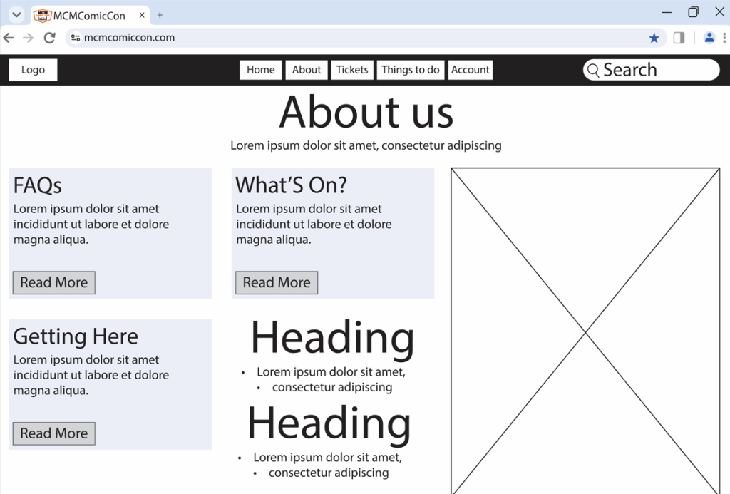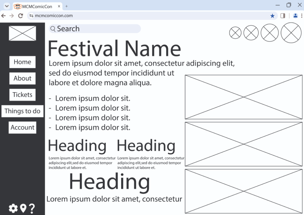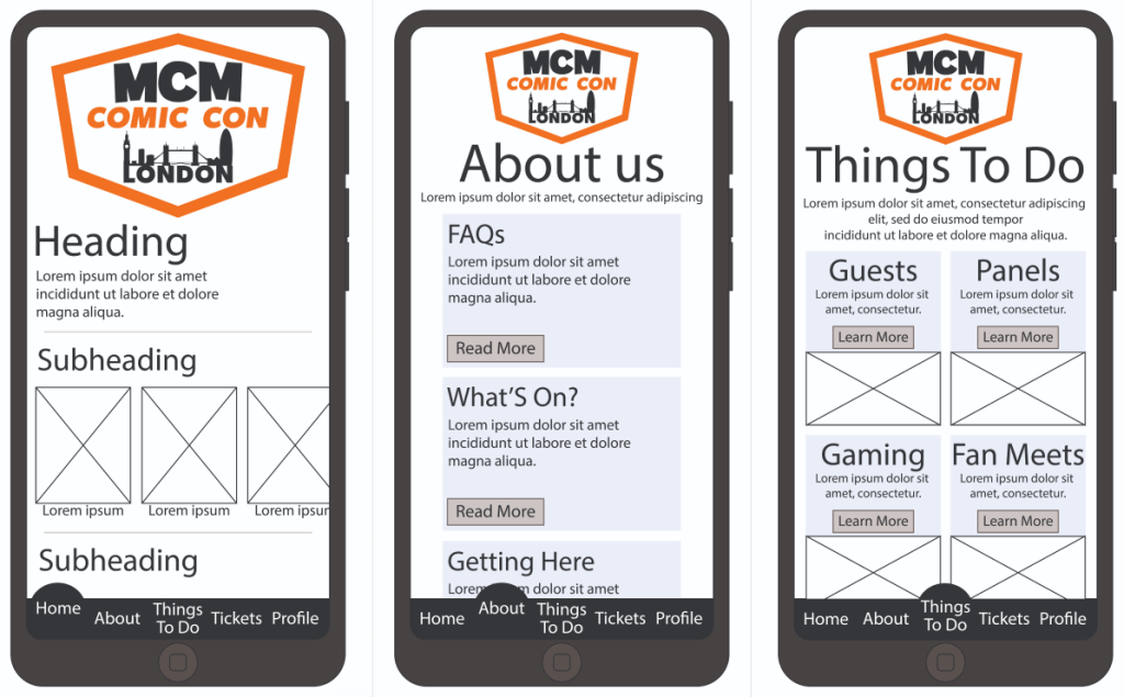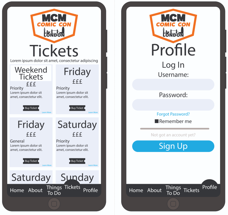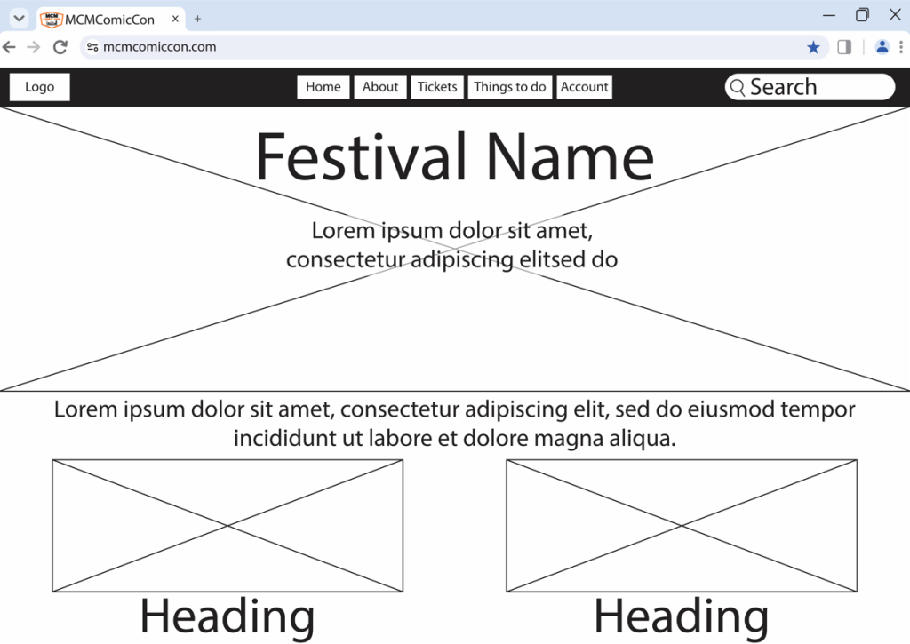 Because I created a rejected/ rough design, the prototype creating was completed quite quickly. As the prototype is created as a wireframe it still lacks the house style colours, the logo in the top left, images etc. However, when creating a high fidelity design the colours shall all match the original website, as its still based of MCM Comic Con.