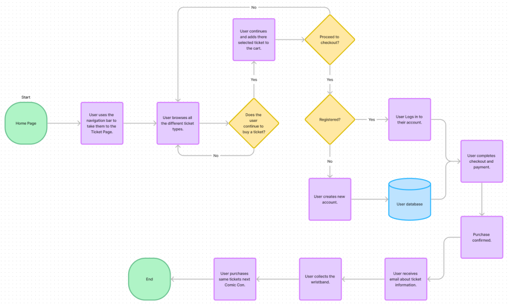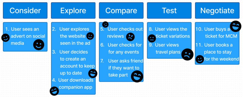 My user journey map is the key steps representing what and how the user would react to seeing an advert for my festival up to purchasing tickets for it. A user journey map is a visual representation of the steps and interactions a user shall go through when using some sort of system. These maps can also present the users feelings, such as frustration or confusion, happiness, at any of the steps the user is needing to take. I showed these emotions using Figma emoji icons.