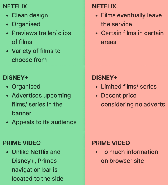 The three most common competitors in the movie streaming industry are Netflix, Disney Plus and Amazon Prime Video. Each company include pros and cons. Down to design, accessibility, subscription price, limited movies etc.