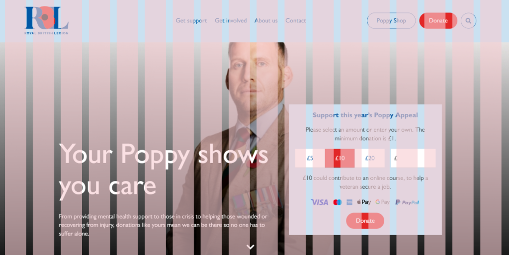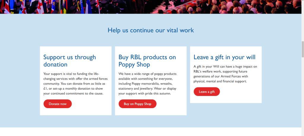 As you scroll down the Royal British Legion website they continue to make great use of placement between each section. Gutters are a technique used to clearly separate sections to show the user they are about to read something new or something different.