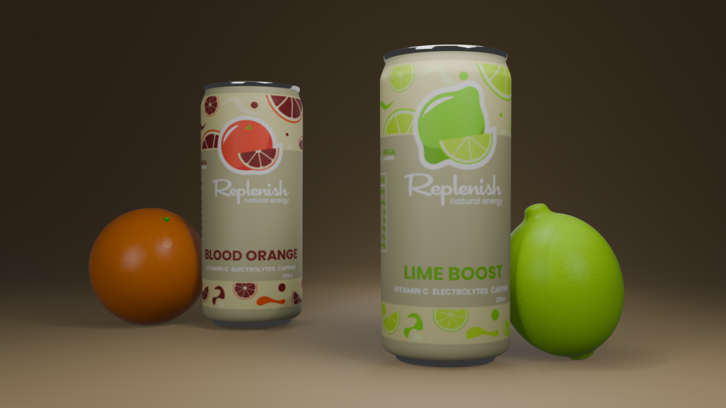 As I mentioned I wanted to incorporate Tufte’s theory on the use of colour. The best way to present it was the choice of colours for the drink cans, and what colour the backdrop was. “For example, brighter colours can highlight crucial data, while tones can serve as background elements, ensuring that the focus remains on what matters most (energy drink)” is what I said about the use of colours. I kept a majority of the colours beige, using different tones and hues to create a more memorable brand/ house style. Whilst adding a variety of light types in blender helped the viewers understand what is the most important elements in frame. Because the lights are only focused on the drink cans that darkens the rest of the backdrop, as it not as important as anything else so the audience have no reason to look there.