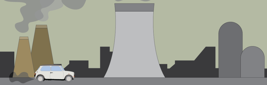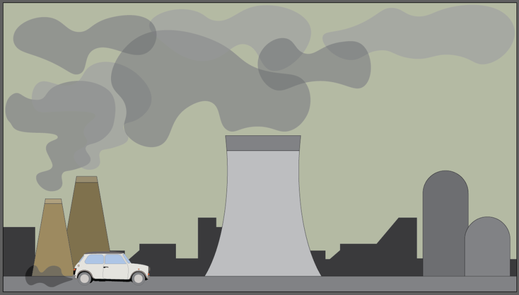Colour choices are key to guiding the viewer’s eye and boosting attention in my animation. By using specific colours, I created visual hierarchies that highlights more important elements of information. Brighter colours can draw attention to crucial data (for my example the cooling towers), while muted tones and hues can serve as background elements (the dark city behind everything), ensuring the focus remains on what’s most important