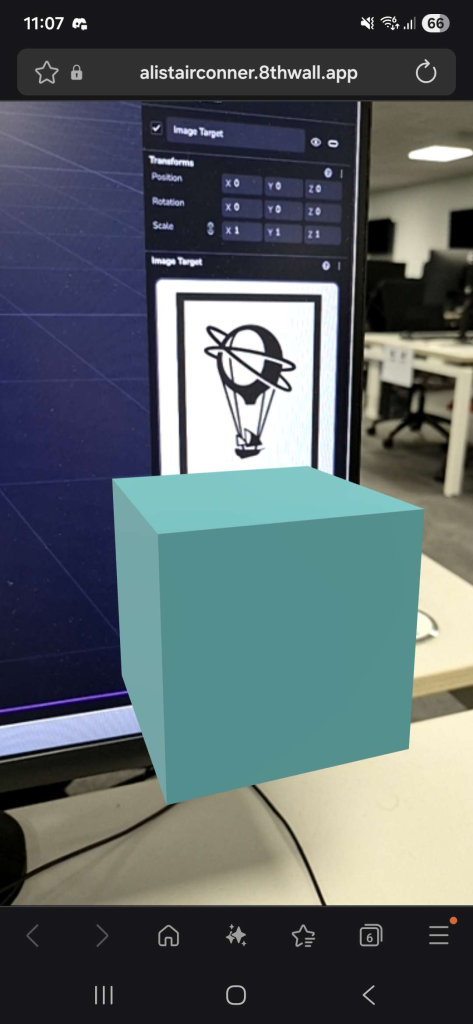 After completing the image tracking tutorial and have it successfully working it gave me a better idea of the possibilities 8thwall has to offer. From this design features I would be able to import multiple pre-made assets from other software’s all to be presented in one spot in the real world. And as a Graphic Designer that would be another effective way to build up a portfolio.