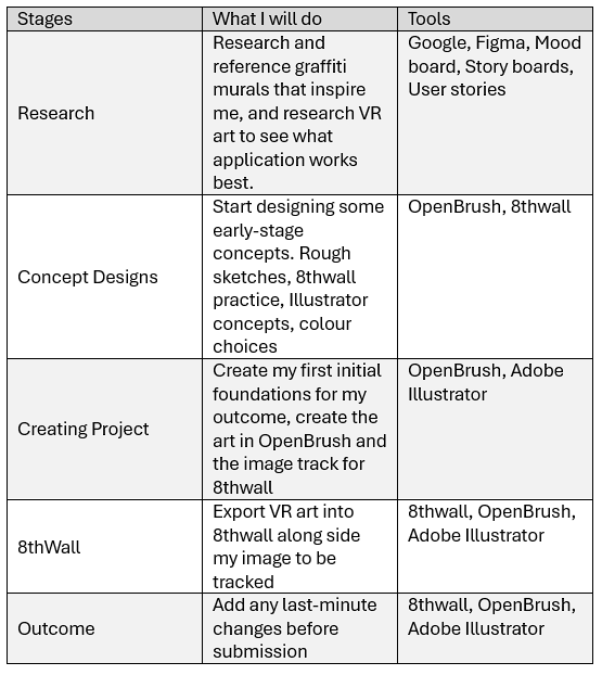 For my project, I want to incorporate a couple of emerging technologies I have learned over the past few weeks. I want to use a VR headset to create a three-dimensional, graffiti-style mural that can be exported and placed within the 8th Wall browser software to appear as image tracking within the real world. So my intentions is to create a large piece or artwork in the style of graffiti in virtual reality. I have been experimenting previously with OpenBrush, however there are many other apps that I could possibly try given the time I have. I will then export my artwork into 8thwall where I can create a simple yet effective image tracking. And in order for the image tracking to actually work I will have to create some form of design asset my audience will be able to scan and view my artwork. This could be an advertisement/ poster design I could easily create using Adobe Illustrator.