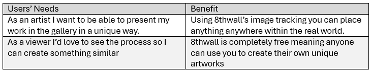 Another Tool I shall be using is called 8thwall. 8thwall is a web-based augmented reality (WebAR) platform that allows developers to create interactive AR experiences that run directly in a web browser, eliminating the need for a dedicated app. Acquired by Niantic in 2022, the platform provides tools for developers to build and publish these experiences across various devices, from smartphones to AR/VR headsets, reaching billions of users. Users can freely access AR content directly through a website, making it seamless and accessible without an installation process, simply by scanning a QR code. 8thwall shall be my tool that presents my final outcome, it will supply the user with a QR code that will then allow them to scan my designed poster, letting the 3D artwork I made in OpenBrush to present on their phone in the real world.