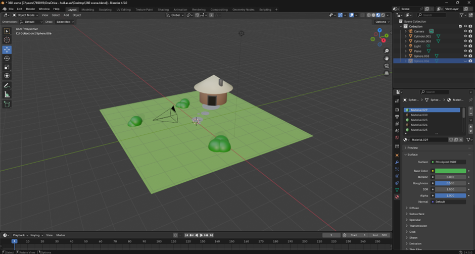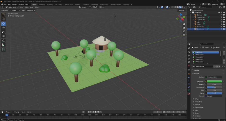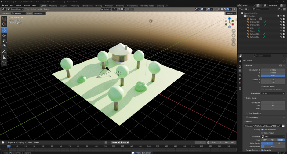 For my first exercise we were tasked with using either Maya or Blender to create a short 360 immersive video. I wanted to stick with the programme I worked best with so I settled with using Blender for this exercise and to save time I created a still 360 video, therefor the camera doesn’t move, meaning I would technically only have to render one frame. Seen as this was only a first draft idea I didn’t add much texture into my objects, basically only using solid colours to tell them apart, but with more time spent and details added this idea of a 360 video would be a great start into making an immersive film for my proposal.